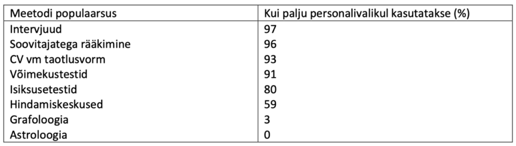 Tabel 2. Personalivaliku meetodite populaarsus – kui paljud ettevõtted ühte või teist meetodit rakendavad. Kohandatud allikast: Anderson ja Snell (2000)