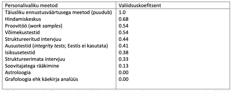 Tabel 1. Personalivaliku meetodite valiidsus – ühe meetodi ennustusväärtus parima kandidaadi leidmisel. Kohandatud allikast: Schmidt ja Hunter (1998)