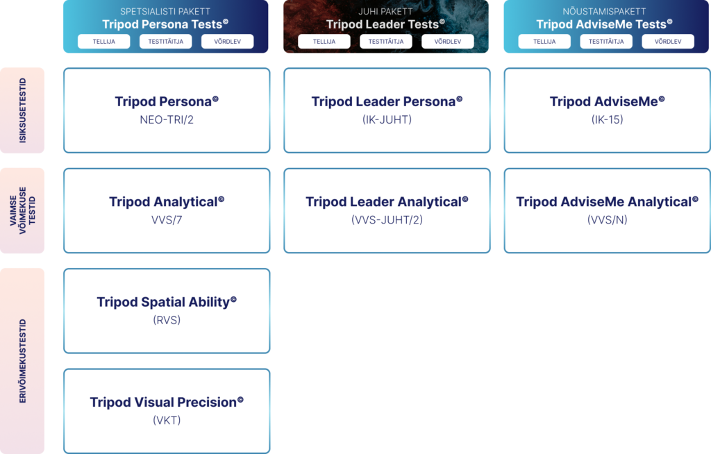 Üleüldiselt võib teste jagada nelja rühma: võimekustestid, isiksustestid, hoiakute testid, teadmiste ja oskuste testid. Tripod pakub isikuse- ning vaimse võimekuse teste.