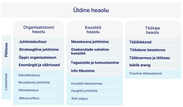 • organisatsiooni heaolu omadused – kombineerides andmetepõhist lähenemist ja praktilist juhtimiskogemust, oleme sõnastanud kolm organisatsiooni heaolu omadusi käsitlevat vaadet. Teisisõnu on tegemist sisuteemadega, mis käsitlevad organisatsioonide toimimise paremaid praktikaid ning peamisi väljakutsekohti;
